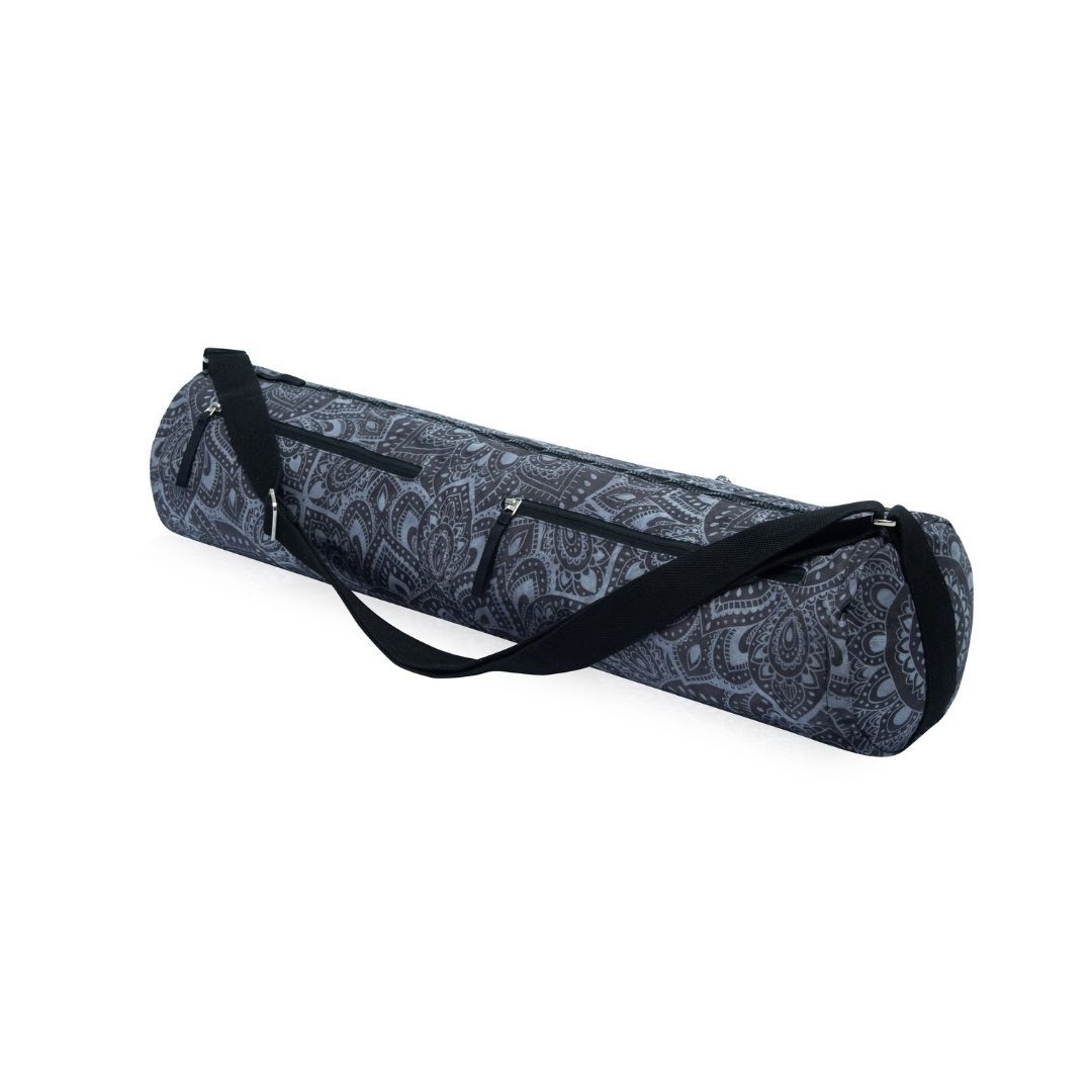 Keep all your yoga essentials in one place with the Recycled PET Yoga Bag in Mandala Charcoal print. Fits all size yoga mats. Keep your keys, wallet, and phone in any of the five pockets on this bag. Made from recycled plastic bottles microfiber, adjustable shoulder straps/sling.