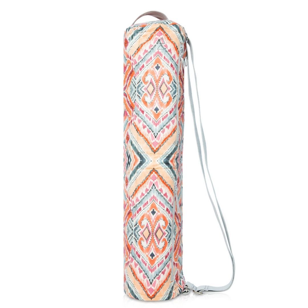 Keep all your yoga essentials in one place with the Recycled PET Yoga Bag in Java print. Fits all size yoga mats. Keep your keys, wallet, and phone in any of the five pockets on this bag. Made from recycled plastic bottles microfiber, adjustable shoulder straps/sling.